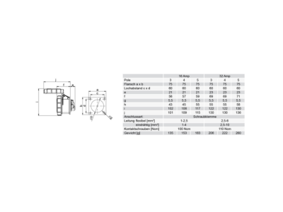 zásuvka vestavná 3-pólová, 32A / 230V, 6h, IP67, příruba 75x75mm, přímá